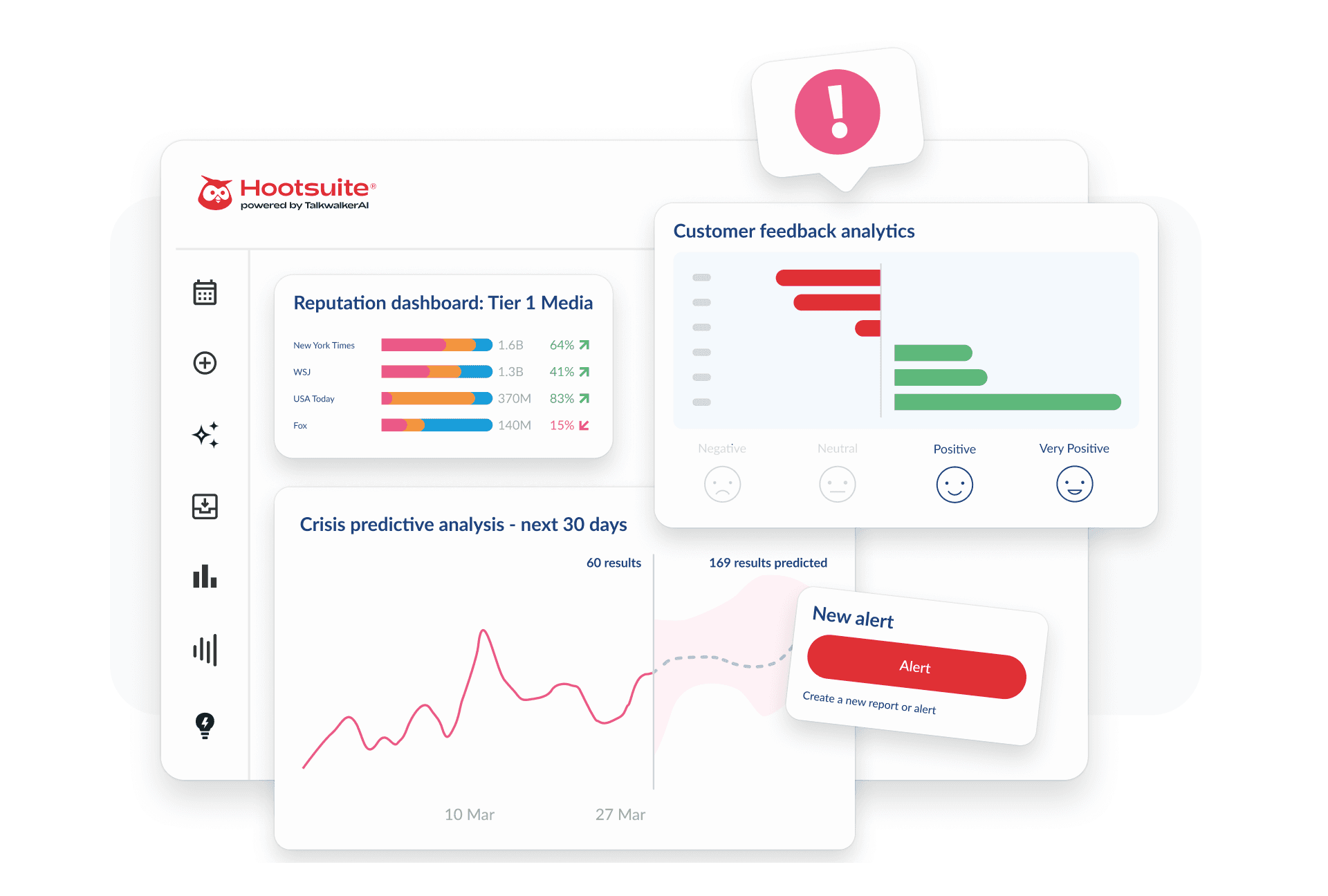 Corporate reputation management is the practice of monitoring and influencing how the public, customers, investors, and employees perceive your brand. Hootsuite powered by Talkwalker AI helps by providing real-time media monitoring, sentiment analysis, and issue detection across all channels — so you can protect your corporate image and respond quickly to emerging risks.